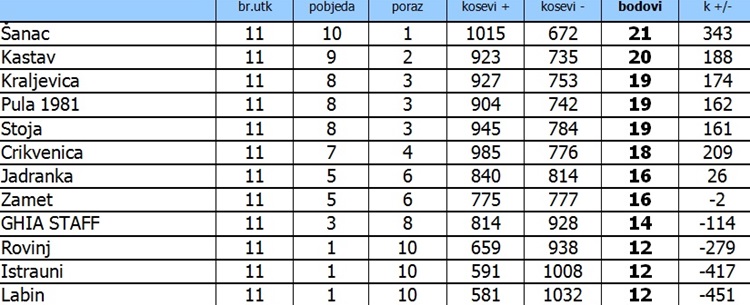 KASTAV: Barnjak 16, Ratko 15, Miletić 11, Lipovšćak 8, Benković 7, Katalinić 5, Mandičić 5, Šarčević 4, Santini 3, Kučan 3, Mandekić 2, Dobrić 1.
